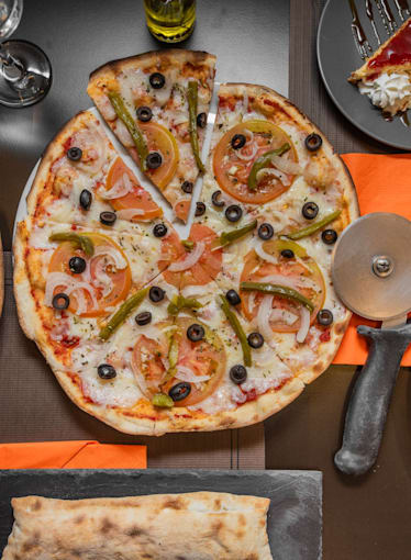 Topped With Jalapeño Peppers, Ham, Green Peppers, Mushrooms, Black Olives And White Onions
